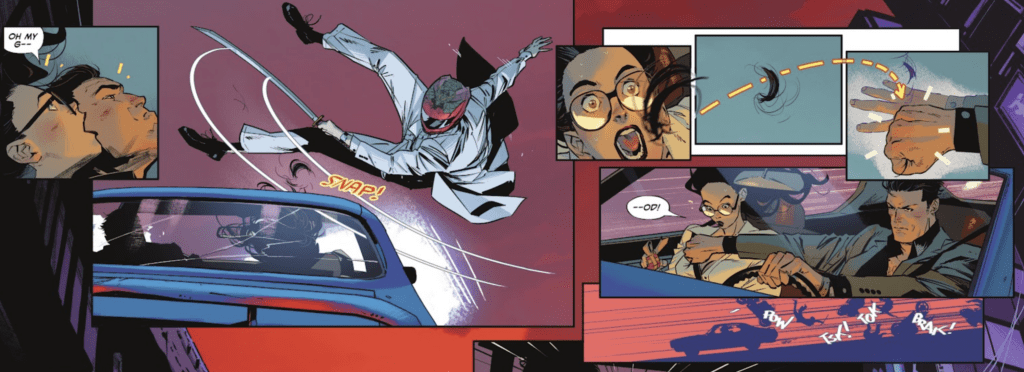 Recap: The action starts on page 1. As soon as our couple is in the car, Bruce notices a tail. Quick, punchy dialogue adds a sense of whimsy to what turns into a harrowing altercation with a sword wielding motorcycle gang, apparently out to eliminate the good doctor. Along the way, Bruce is thwarting the would-be assassins with his driving skills. They eventually reach Little Tokyo and crash in an alley. Still running for their lives, they encounter…The Ōjō! Bruce throws Annika into a dumpster so he can fight, but is fairly evenly matched. The return of the bikers spooks The Ōjō, who turns into a flock of birds to escape, but doubles back to take out the bikers as our endangered couple flees. They climb to the top of a building for…reasons? But The Ōjō is there! Bruce is about to throw down with her, but Damian intervenes. The issue concludes on a fantastic reveal.