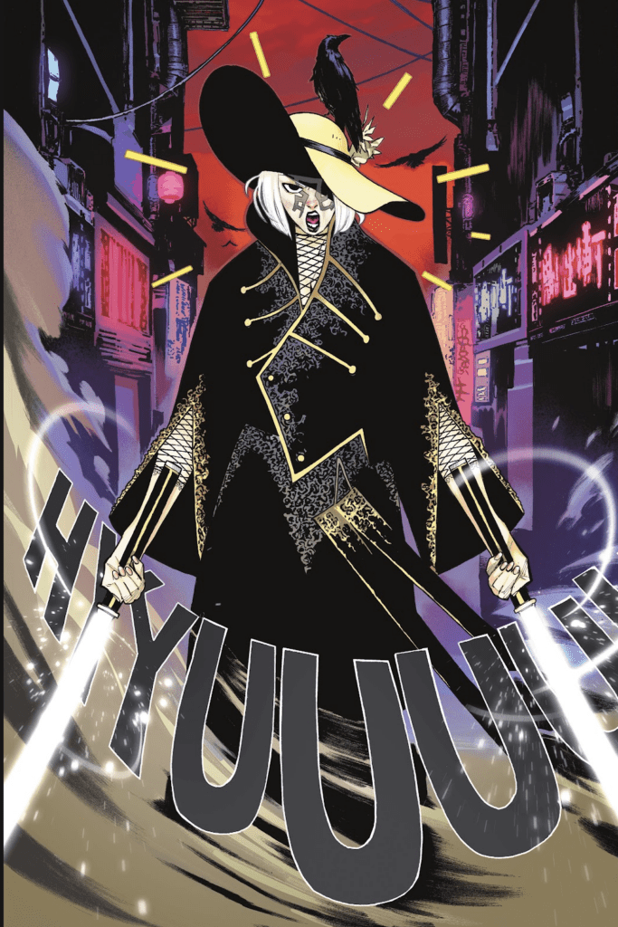 Jeremy: The design of The Ōjō’s costume is stunning. So much detail in the clothing. The glowing swords are pretty AND very dangerous. The bird element is interesting. I can’t wait to learn what Damian knows about her. There was, however, a last minute name change. She was first billed as “Lady Death Man,” apparently tied to an established character. DC gave no reason for the change. From what I could find, her new name, “The Ōjō,” may be a bastardized version of “ojou,” which means young lady.